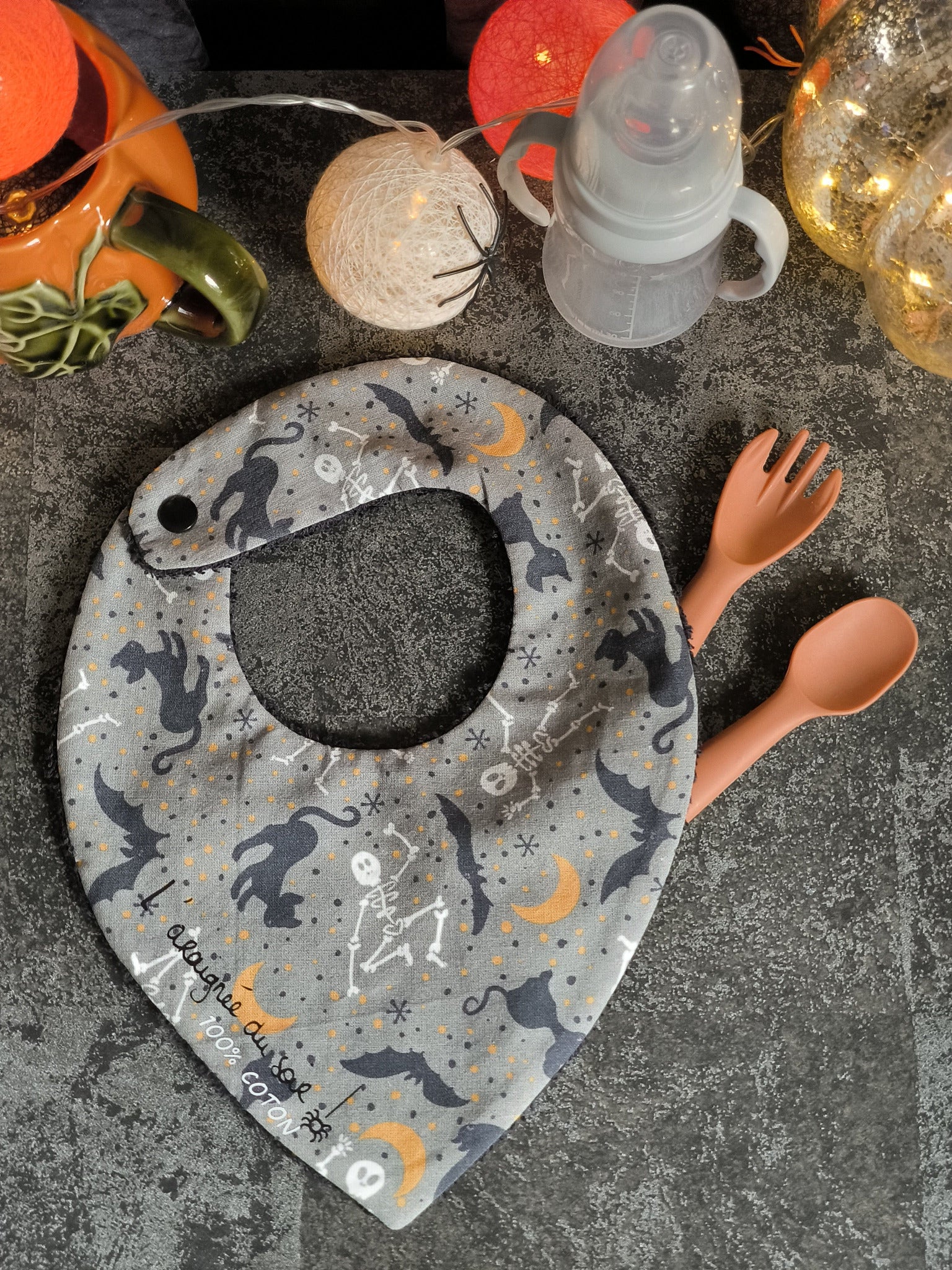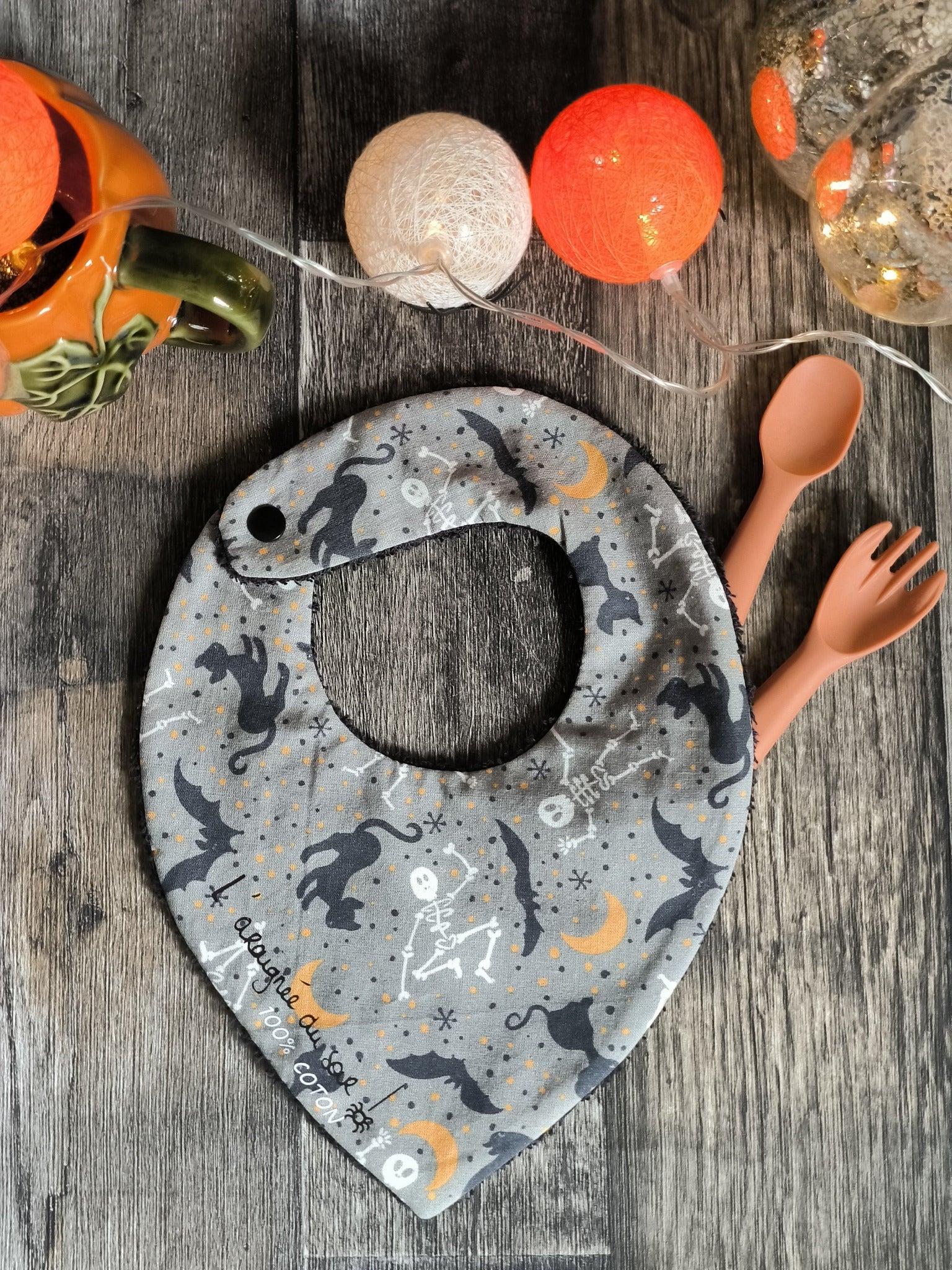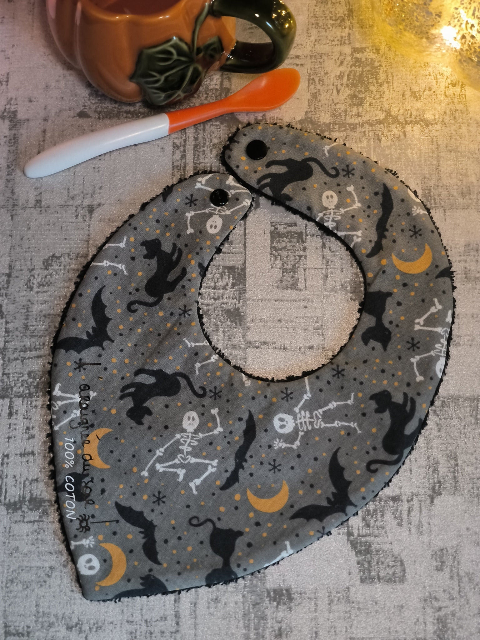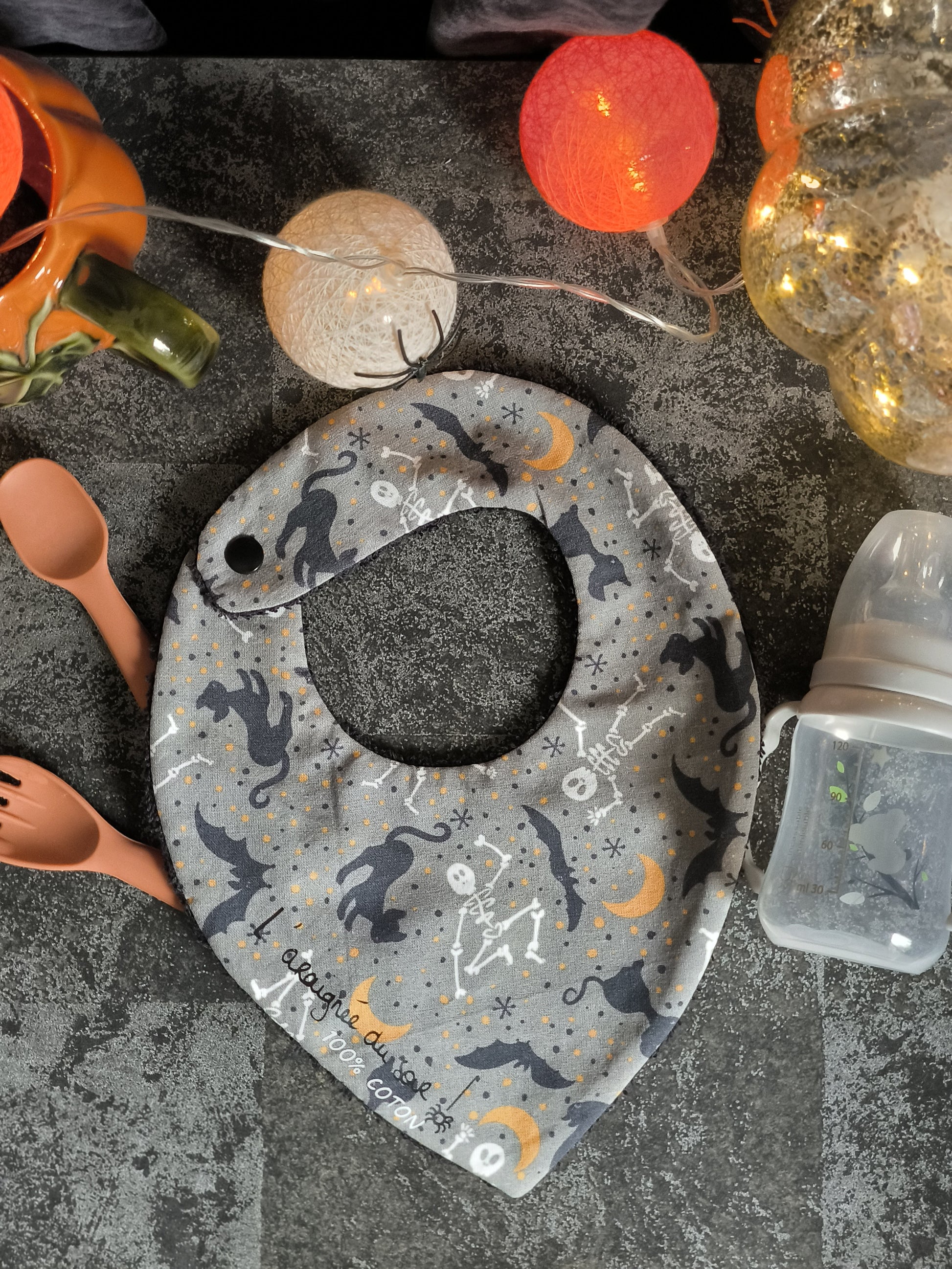 Ce bavoir artisanal est réalisé en coton gris, décoré de silhouettes noires : chats noirs, squelettes, chauves-souris et croissants de lune, pour un style Halloween graphique et mignon.