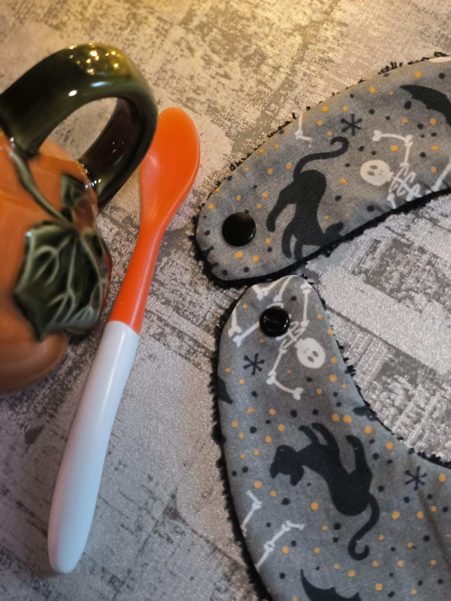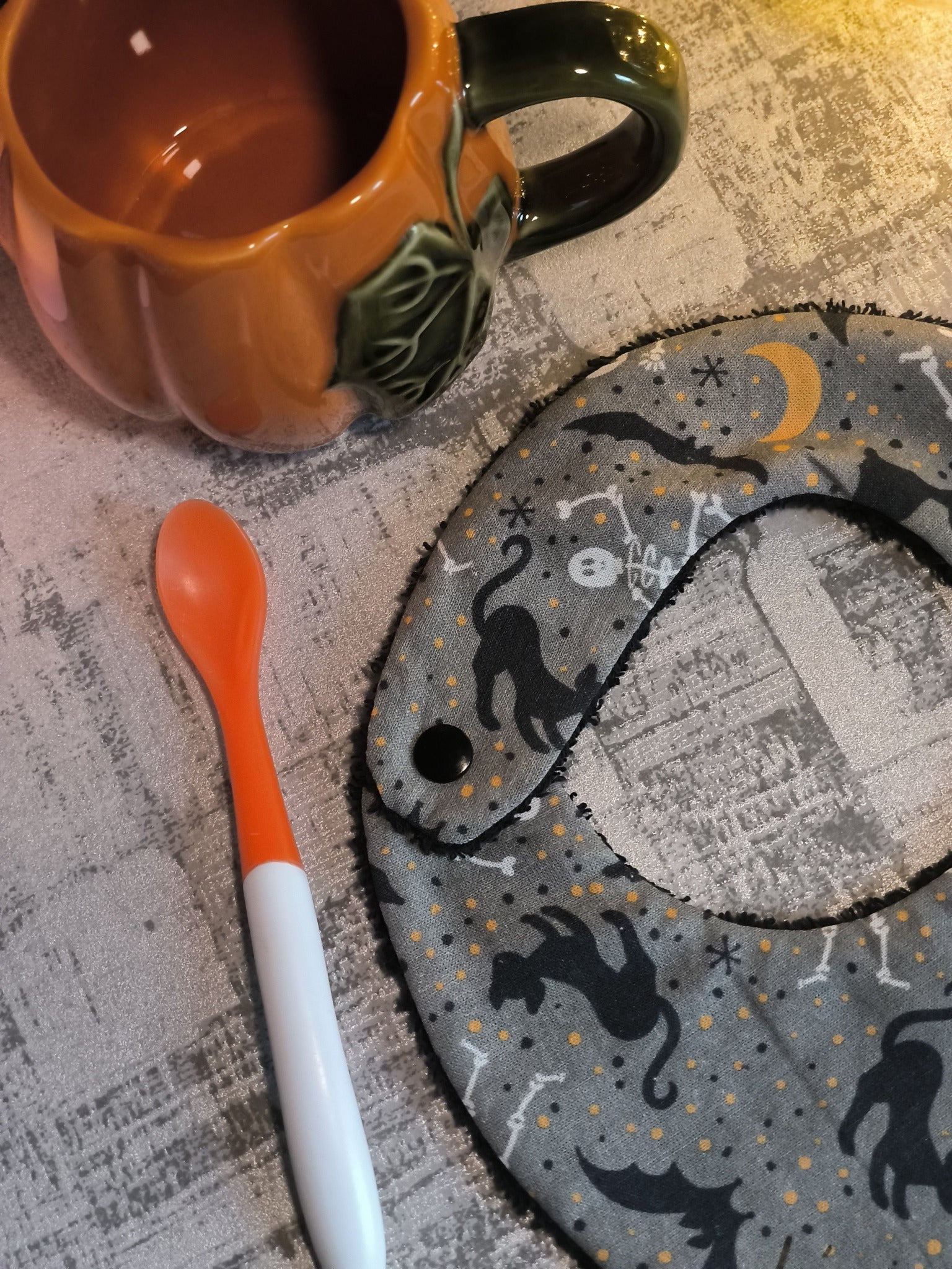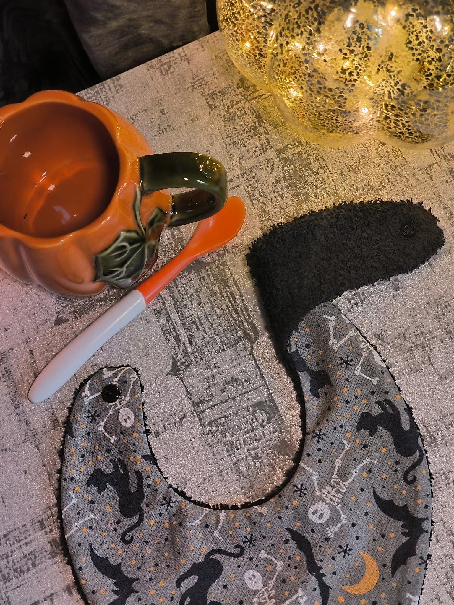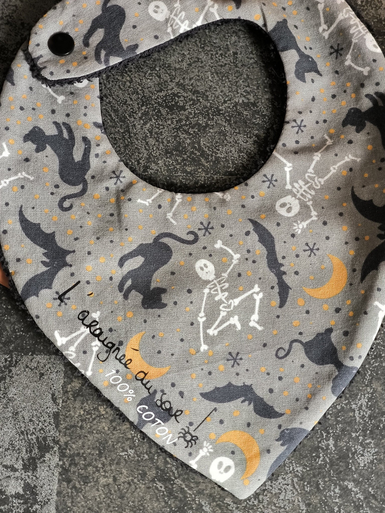 Ce bavoir artisanal est réalisé en coton gris, décoré de silhouettes noires : chats noirs, squelettes, chauves-souris et croissants de lune, pour un style Halloween graphique et mignon.