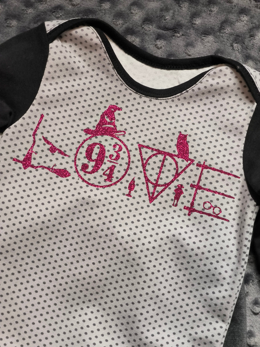 Réalisé en jersey de coton souple et respirant, il associe un coloris gris à pois gris foncé, très doux au motif pailleté "LOVE" inspiré d'une saga d'un jeune sorcier et de ses aventures à l'école de magie. Les manches longues en jersey noir crée un look original et audacieux.