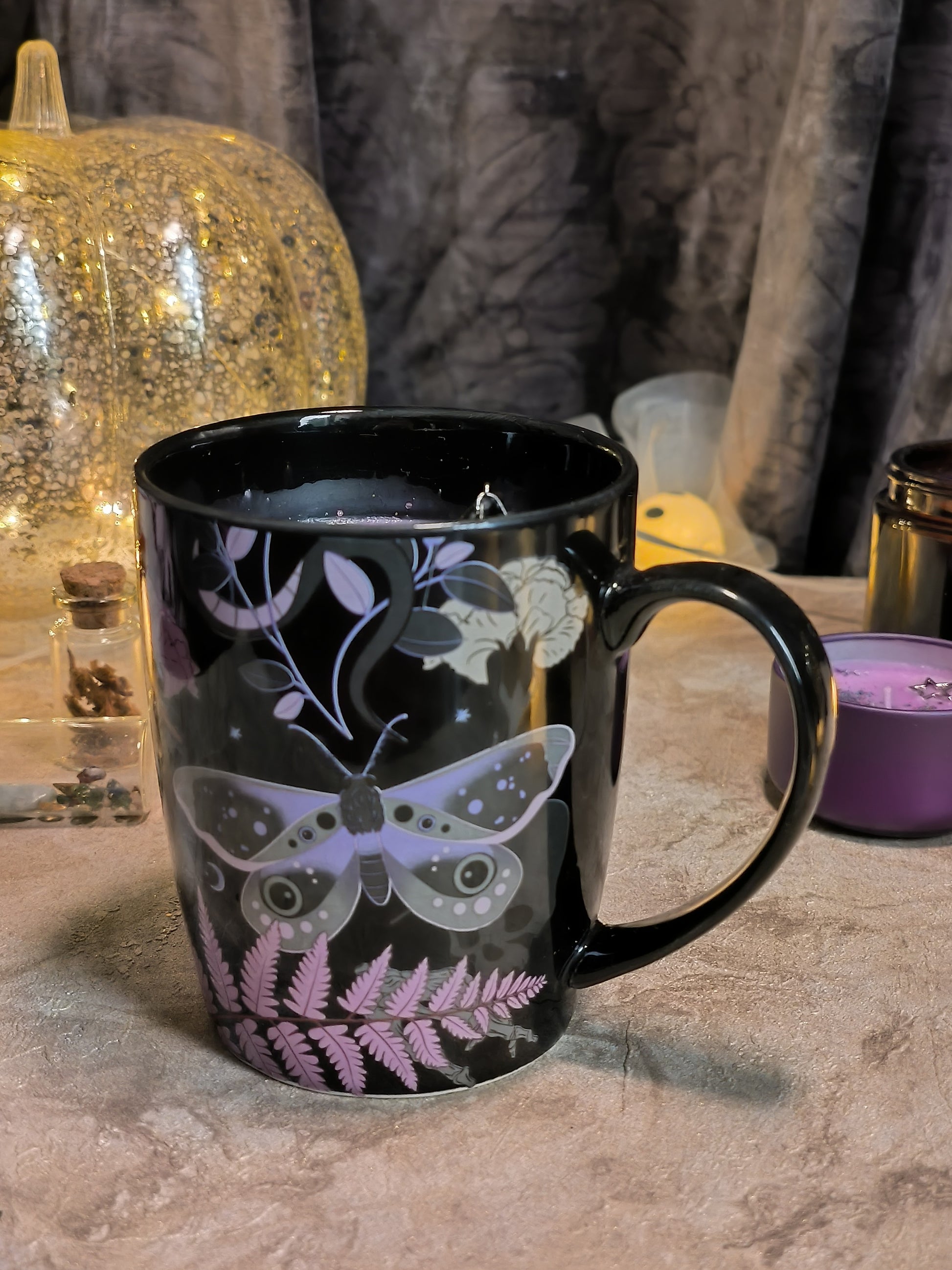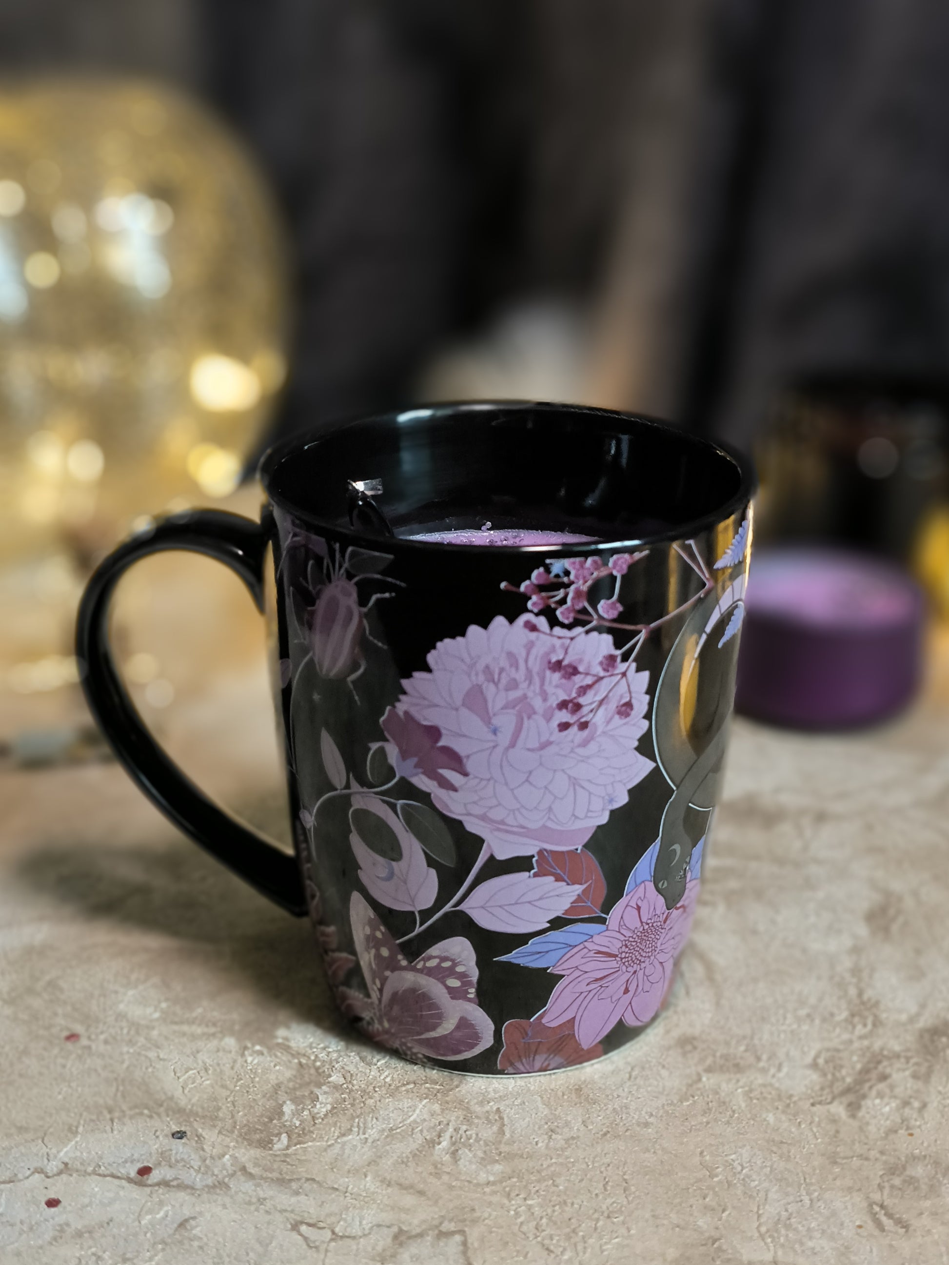 Contenant : Tasse noire décorée de papillons de nuit, insectes & motifs végétaux (violet & rose). Chaque tasse est différente et peut avoir de légères disparités.