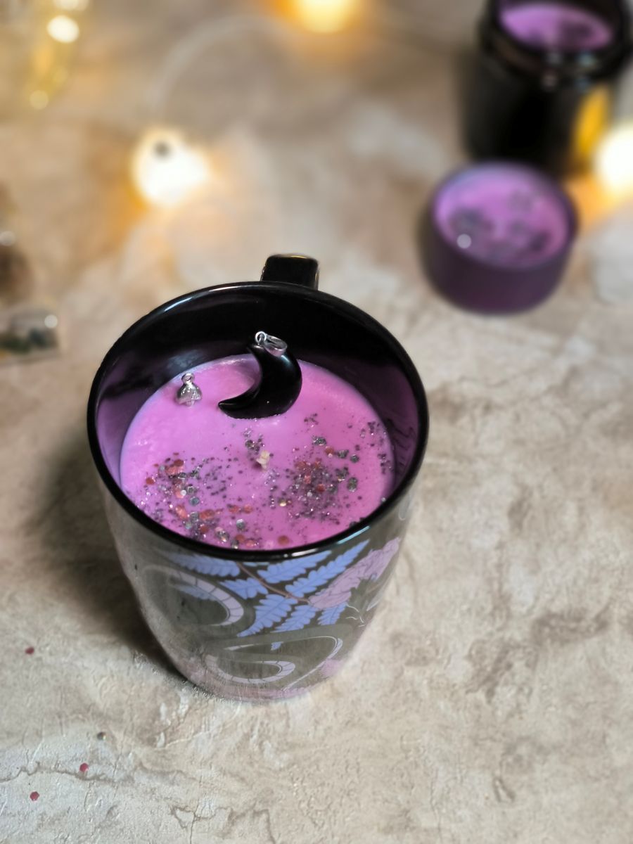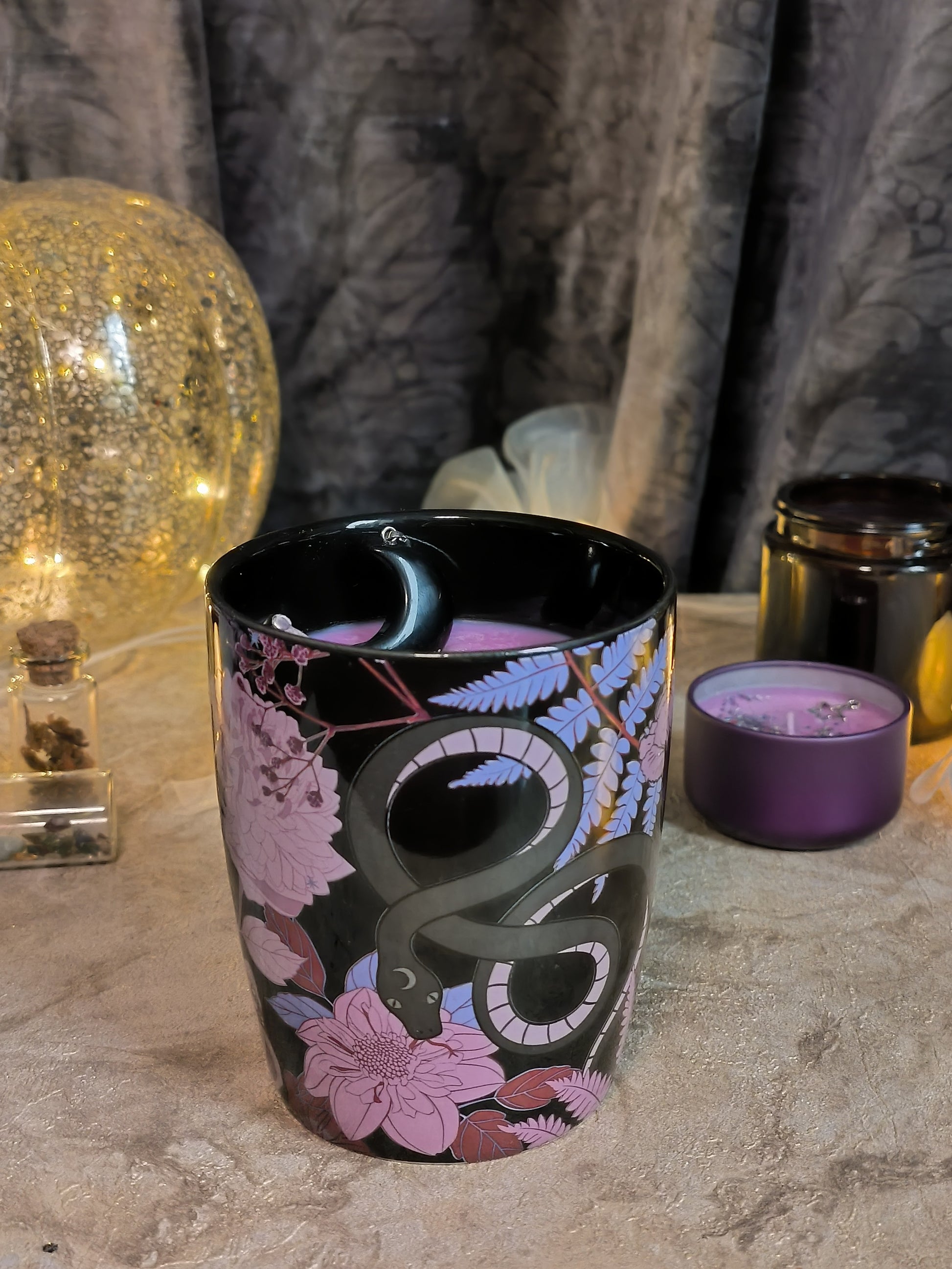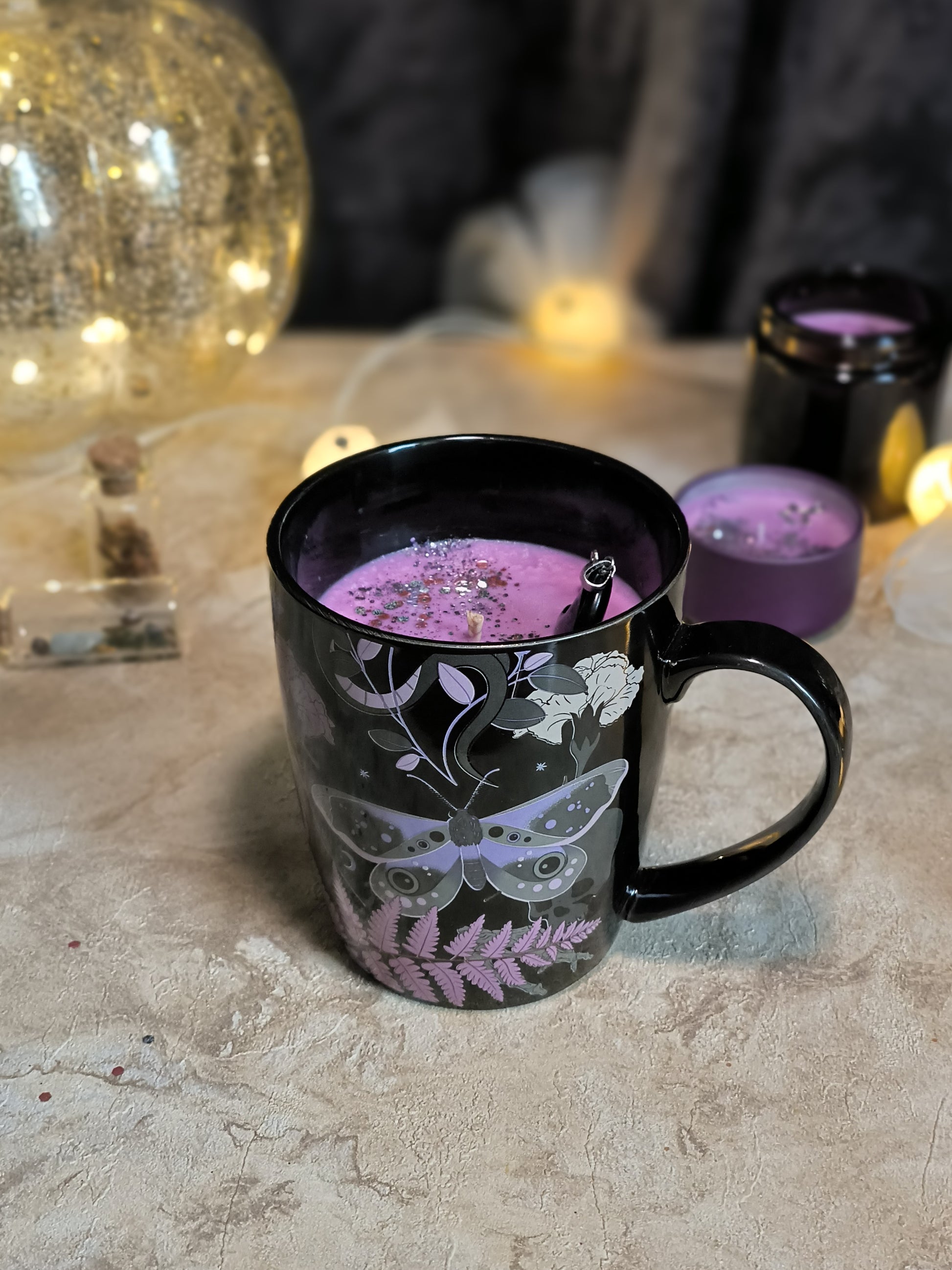Mystérieuse et envoûtante, cette bougie artisanale coulée dans une tasse noire décorée de motifs violets et roses représentant papillons de nuit, insectes et végétaux est une véritable invitation au voyage intérieur.